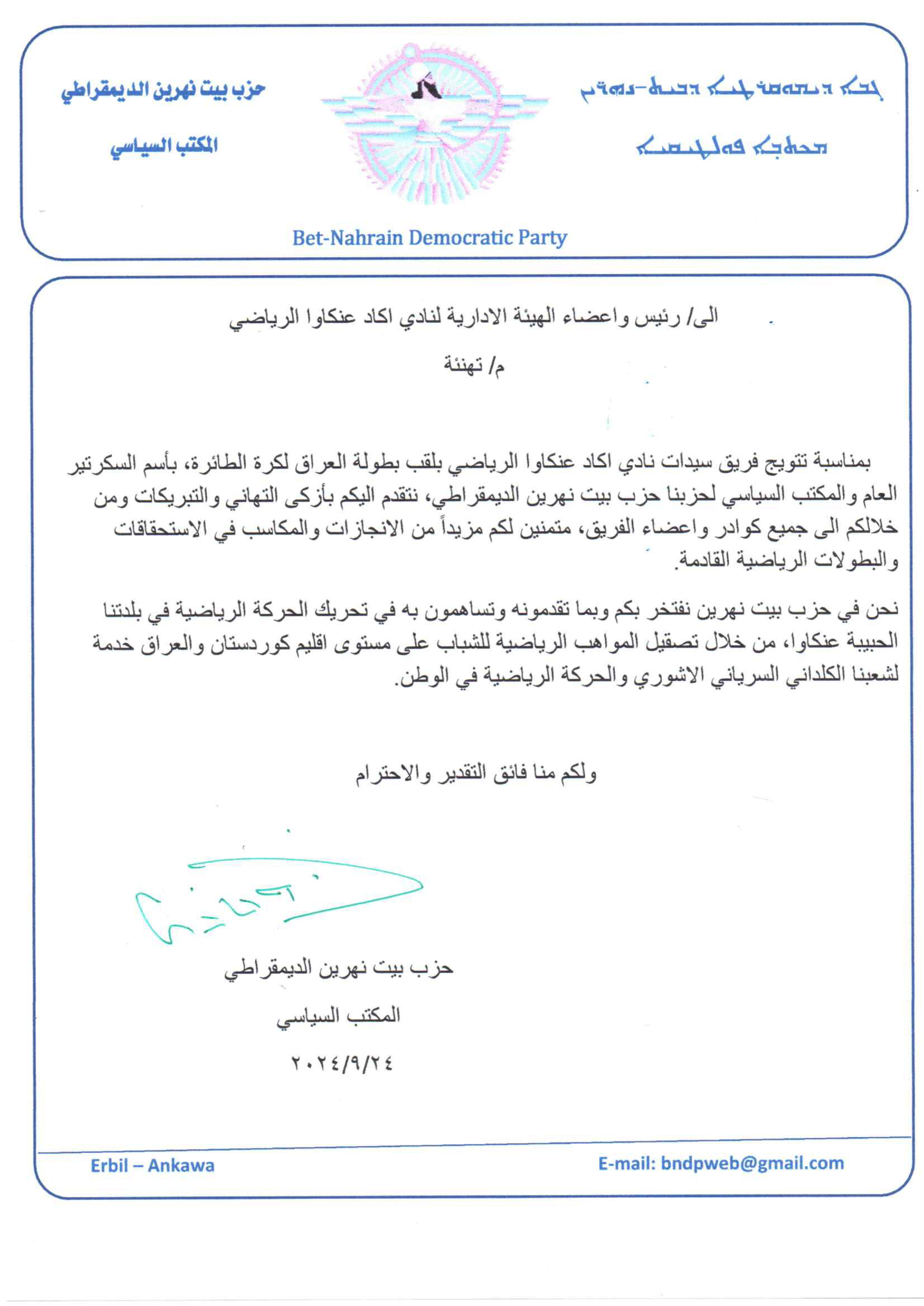 بمناسبة تتويج فريق سيدات نادي اكاد عنكاوا الرياضي بلقب بطولة العراق لكرة الطائرة، بأسم السكرتير العام والمكتب السياسي لحزبنا حزب بيت نهرين الديمقراطي، نتقدم اليكم بأزكى التهاني والتبريكات ومن خلالكم الى جميع كوادر واعضاء الفريق، متمنين لكم مزيداً من الانجازات والمكاسب في الاستحقاقات والبطولات الرياضية القادمة.
