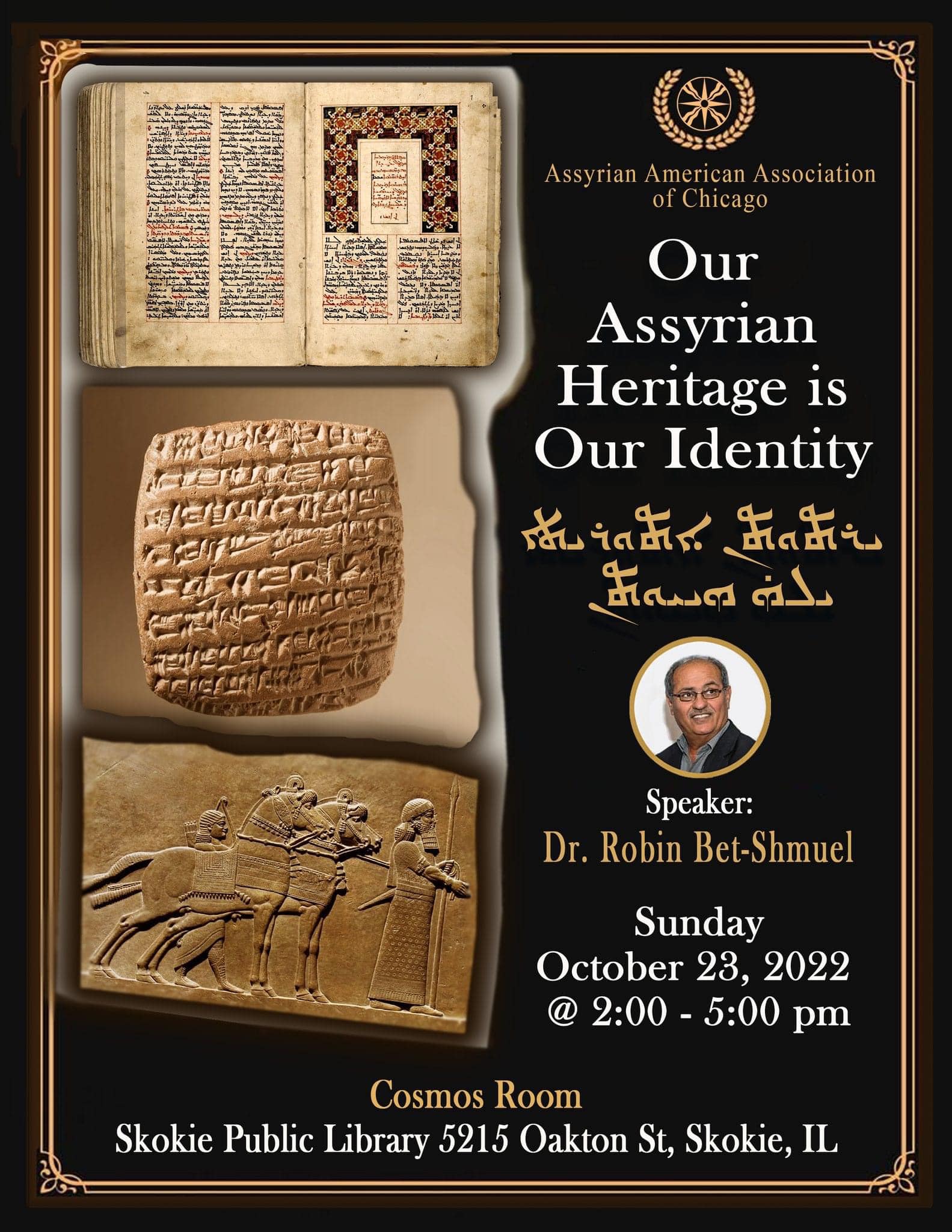 في مكتبة سكوكي العامّة في مدينة شيكاغو الأميركية، نظّمت الجمعية القومية الآشورية في يوم الأحد 23/10/2022، لقاءً ثقافياً للدكتور روبين بيت شموئيل مع نخبة من مثقفي وفناني شيكاغو، ارتجل فيه الضيف المتحدث خطاباً باللغة الأم حول روابط التراث الآشوري بالهوية القومية. ركّز د. بيت شموئيل في أهمية التراث بكل تجلياته المادية وغير المادية، موكداً أنه يتجذر وبكل عنفوانه في قرانا وبلداتنا وكنائسنا وأديرتنا ومزاراتنا في أراضينا النهرينية التاريخية، حيث يضرب بقِدمِه في أعماقِ التاريخ، ويتواصل حياةً ووجودًا إلى اليوم لينسُجَ هُويتنا القومية ويرسم لونها. ودعا إلى التمسك بالتراث، وإحيائه، وإغنائه، والمحافظة عليه، وتوثيقه قدر المستطاع، فهو يشكل المرآةَ الحقيقيةَ لحضارةِ الشعوب وقِدمِها. وتراثنا السوريثي الذي ورثناه من الأباء والاجداد ليغدو إرثاً جمعياً انتقل من جيل لآخر، وتراكم خلال الأزمنة والعصور، انجزه الفكر الحضاري لشعبنا وتمتد هويته القومية في تربة ميزوبوتاميا لآلاف السنين، مبرهنة على تواصله التاريخي في الوطن الأم، وعدم انقطاعه رغم المحن والاضطهادات والمذابح والتهجير. فأرضنا الأم هي اليوم الحاضنة الأقوى لتراثنا الثر الذي يزيّن بدوره أُطر هويتنا، والعنصر الأهم في تشكيل هويتنا العرقية هو ارتباطنا بالأرض ارتباطاً وثيقاً بالاضافة إلى العناصر الأخرى كاللغةِ الأم، والانتماء، والإرث الثقافي، والتقاليد، والعادات، والطقوس، والاعياد، والأزياء، والمأكولات الشعبية، والدبكات والفنون الفلكلورية وغيرها.