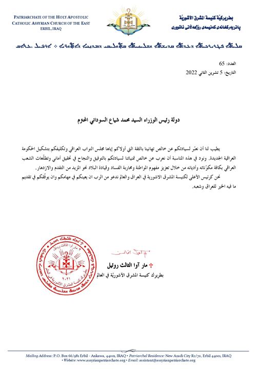 رسالة التهنئة التي بعث بها قداسة ابينا البطريرك مار آوا الثالث، بطريرك كنيسة المشرق الآشوريّة في العالم، إلى دولة رئيس الوزراء العراقي السيّد محمد شياع السوداني.